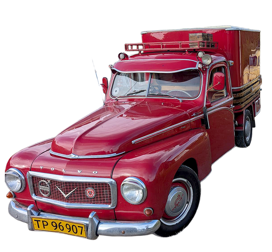 Vores smukke, gamle Volvo 445 fra 1962 har haft et langt liv. Den blev oprindeligt bygget til kreaturtransport for Bjerre Slagter – men i dag har vi forvandlet den til en fuldblods luksus pølsevogn, der skaber glæde og stemning, uanset hvor den kommer frem.