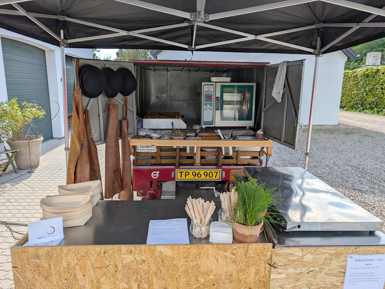 Vi tilbyder også kombi-setup med drikkevarer, kaffe og kage – og i samarbejde med vores venner fra Ristet Rug kan vi lave et ægte dansk madunivers med rug og pølser, serveret fra den nostalgiske pølsevogn.